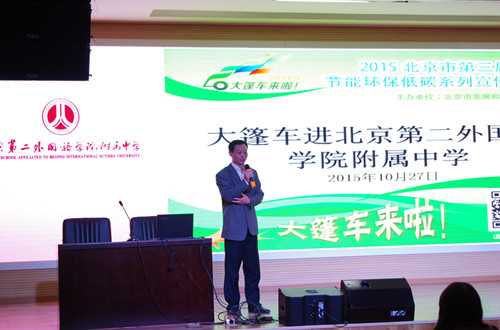 由北京市發展改革委員會主辦的2015北京市第三屆節能環保低碳系列宣傳活動“低碳大篷車”于2015年10月27日走進北京第二外國語學院附屬中學。