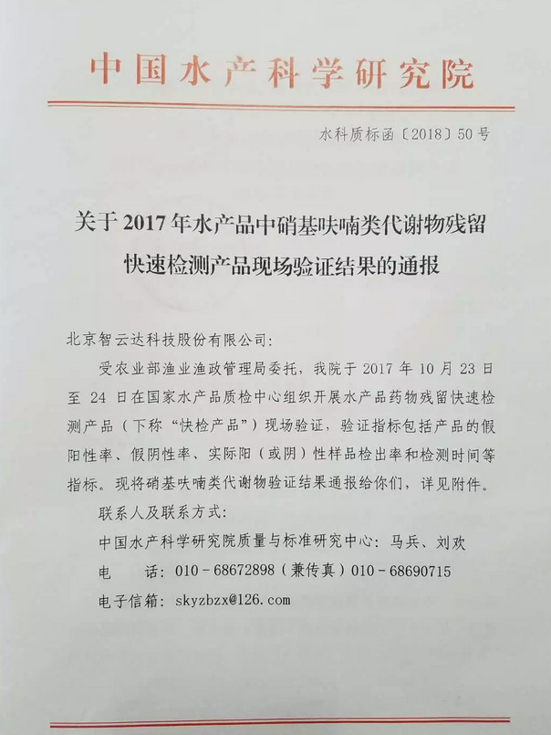中國水產科學研究院質量與標準研究中心受農業部漁業漁政管理局委托 ,運用智云達自主研發的水產品、快檢產品,對水產品中硝基呋喃類代謝物進行快速檢測。2017年10月23日-24日,該檢測在國家水產品質檢中心順利開展。具體文件如下: