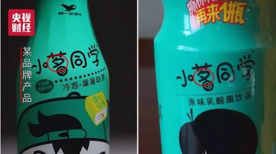 由棗莊初亢食品飲料有限公司,模仿某品牌的小茗同學的小茖同學乳酸菌飲品,半個筆畫的差別足以亂真。