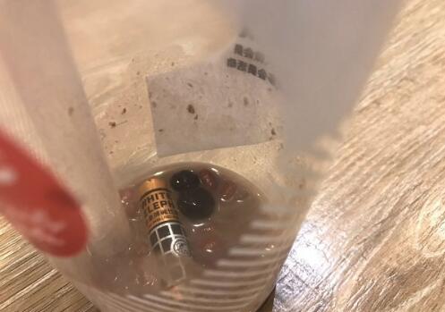 昨日,張小姐透過外賣平臺訂購了三杯85°C飲品,其中一杯是紅豆珍珠奶茶。當奶茶喝到快見杯底時,混在在珍珠和紅豆里的一硬物引起了她的注意。“奶茶里居然有一節(jié)7號電池!這是要給我補充電解質嗎?”張小姐說,電池當時橫置在杯底部,約1/2浸沒在奶茶中和配料中。她懷疑電池應該是一開始就混在原料紅豆或珍珠里,或許其他消費者也會“幸運”買到“電池紅豆珍珠奶茶”。發(fā)現(xiàn)這一情況,張小姐隨即前往店家交涉。店家愿意給予其10倍奶茶錢款的賠償,被她拒絕了。“知名飲品甜點店85℃食品安全做的如此糟糕,如何讓消費者買的放心、吃的放心。”最讓她擔心的是,電池本身帶有毒性,喝了這樣一杯“毒奶茶”,目前也不清楚是否會對身體造成不良后果。由于昨晚要出門旅行,張小姐并未與店家達成一致。