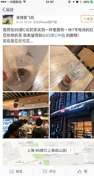 隨后,記者與85℃津味實業(yè)(上海)有限公司取得聯(lián)系。公關負責人王小姐表示,在接到消費者投訴后,第一時間調閱了店員做飲品過程的監(jiān)控,并未發(fā)現(xiàn)有任何操作違規(guī)行為。“店員都是嚴格按照標準流程執(zhí)行,電池基本不可能會出現(xiàn)在操作臺。”王小姐表示,珍珠和紅豆都是需要現(xiàn)煮的“用大鍋煮原料,根本用不到電池,電池也不可能混入。”另外,她還強調,消費者是透過外賣平臺訂的奶茶,并不是第一時間在店里發(fā)現(xiàn)有電池存在,中間存在太多變數(shù)。“本著讓消費者滿意的態(tài)度,店家才會提出以一賠十的補償。對張小姐的遭遇,我們也深感抱歉。”