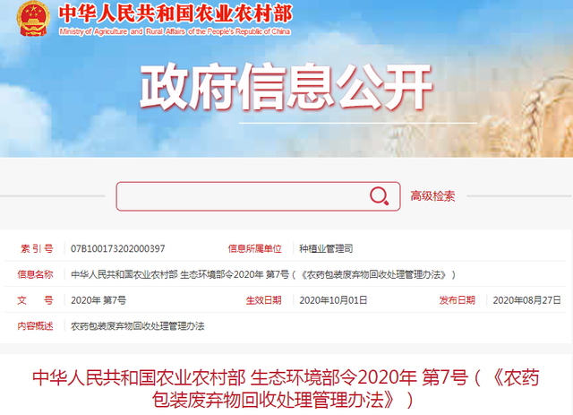 近日,農業農村部、生態環境部發布了《農藥包裝廢棄物回收處理管理辦法》(以下簡稱《辦法》)。《辦法》共五章二十三條,對適用范圍、管理職責、回收體系建立等多方面作出要求,并說明鼓勵機制、明確法律責任。《辦法》將于今年10月1日起施行。 《辦法》規定,地方各級人民政府依照《中華人民共和國土壤污染防治法》的規定,組織、協調、督促相關部門依法履行農藥包裝廢棄...[詳情]